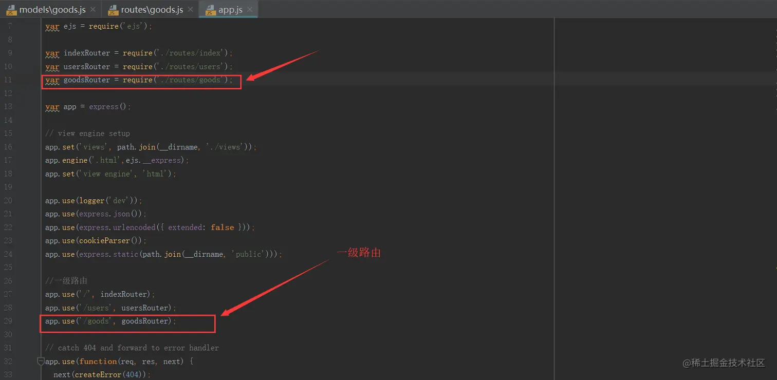 然后在app.js里面建一个对应的一级路由,必须建立一级路由,然后在一级路由下可以增加二级路由(也就是接口)