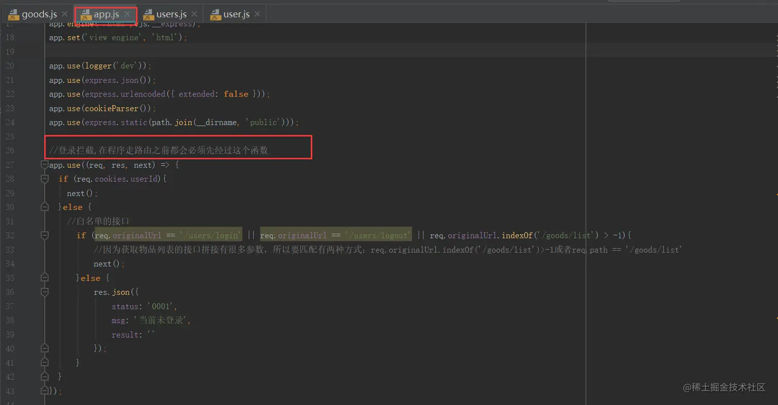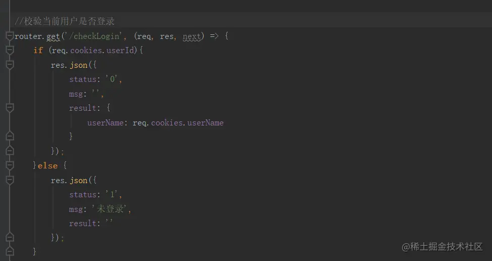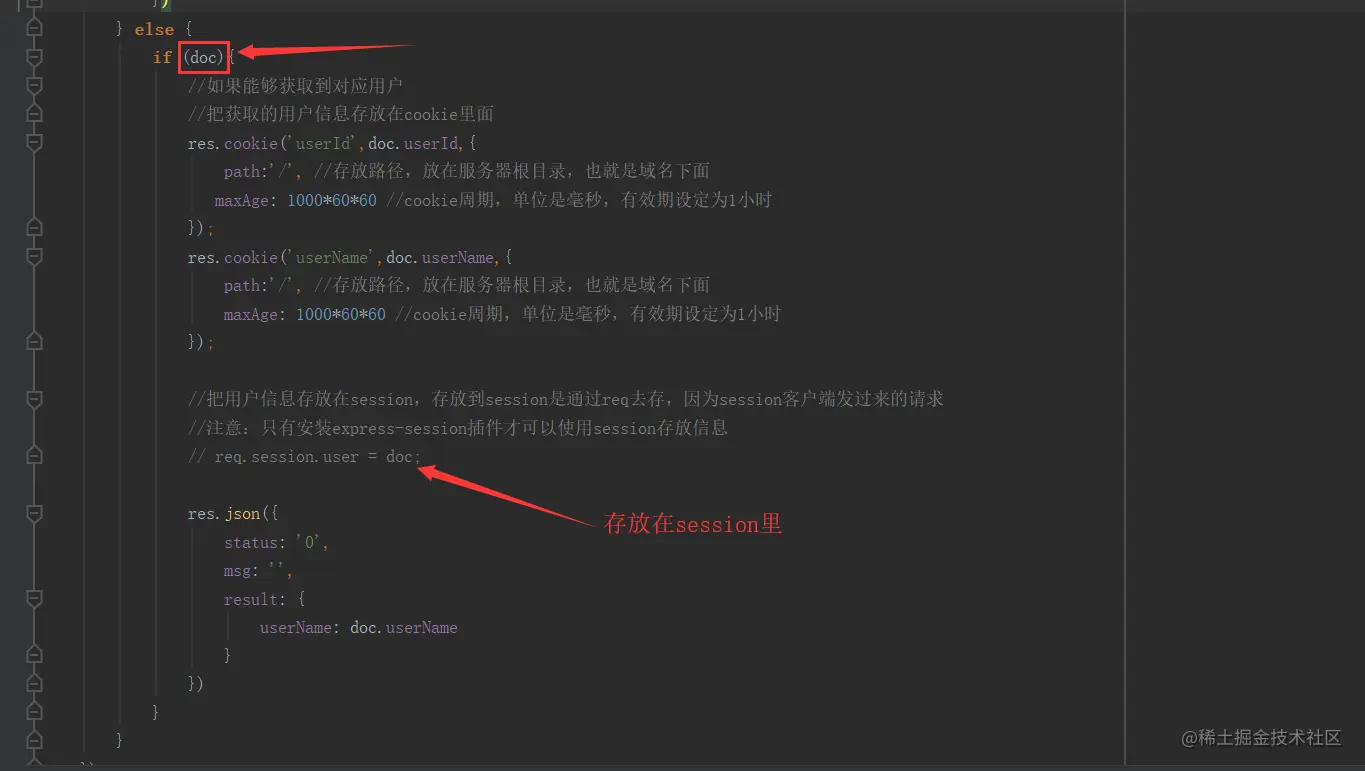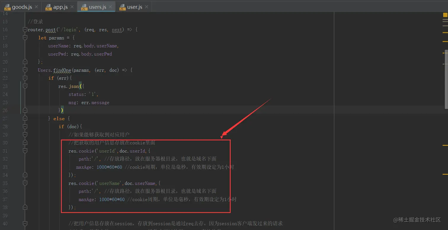获取前端传过来的用户名密码,通过user这个模型去users集合查询有没有对应的用户,如果存在把对应用户的userId,userName存放在服务器的根目录,也就是域名下的cookie里面,然后返回给前端用户名userName