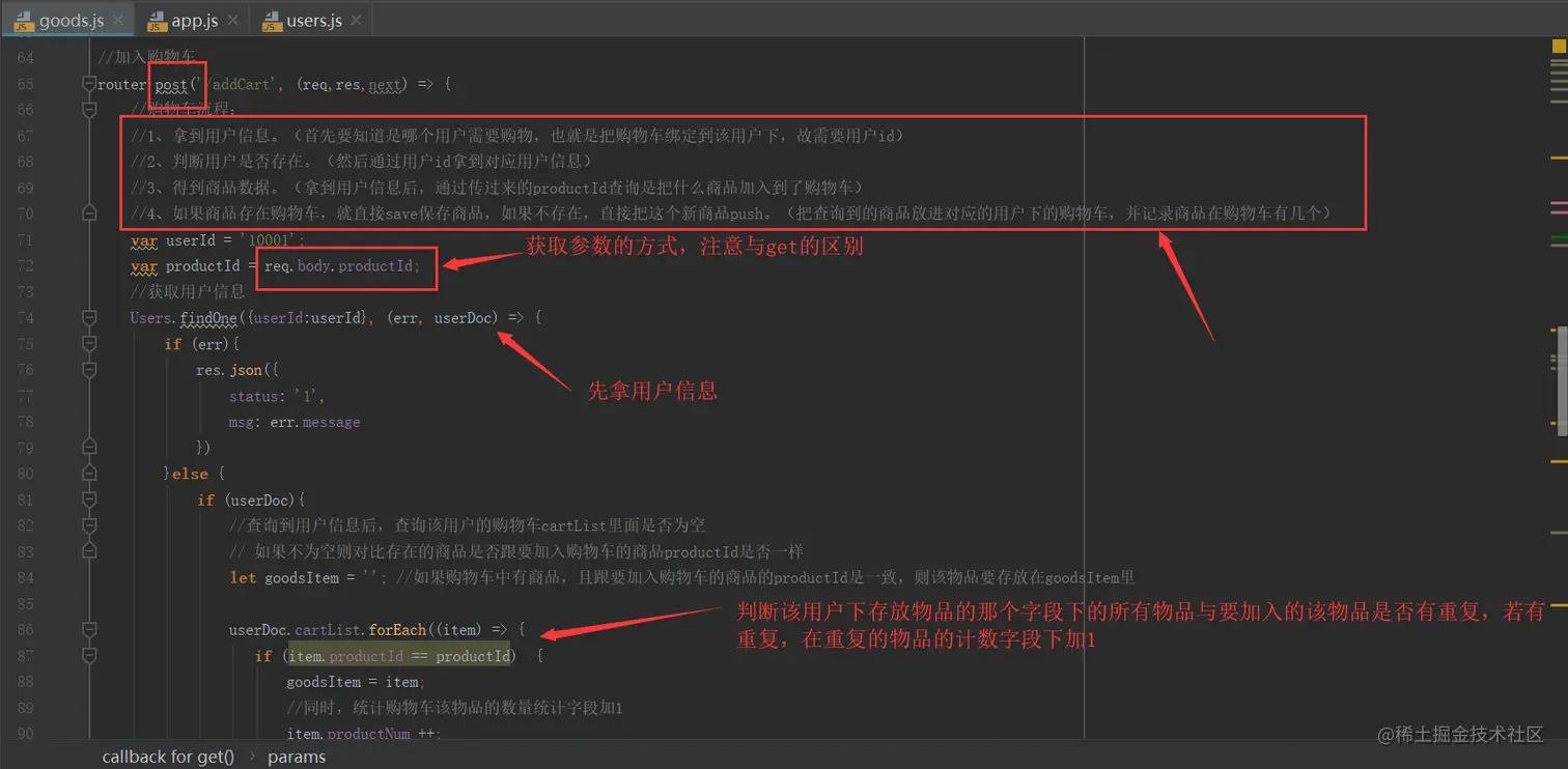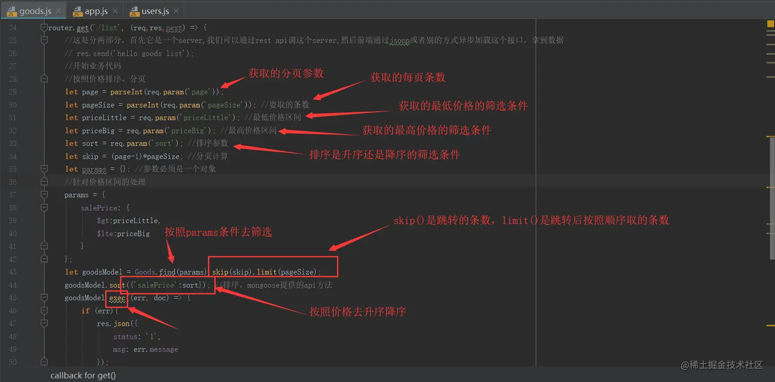 req.param("userId")是express封装的获取参数的api(注意:req.param()是get方法获取参数的api,req.body.userId是post方法获取参数的api),.sort()是排序的方法,其中1是升序,-1是降序。