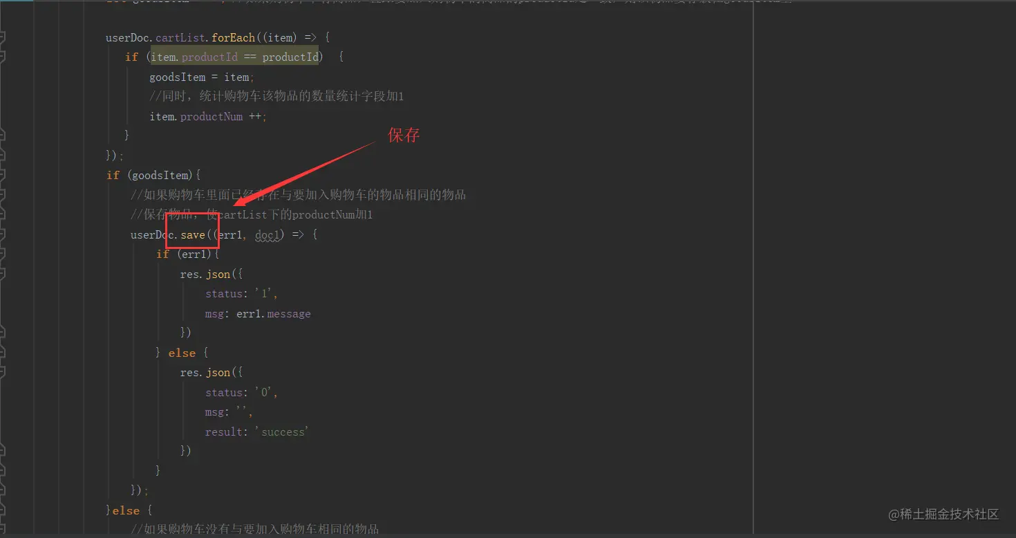 另外一种情况是,如果该用户的购物车里没有要加入的物品,通过前端传过来的productId,去查询物品种类的那个集合(也就是goods),找到对应物品后,在该物品下新加计数字段productNum,是否默认选中字段checked,然后把该物品保存到用户下存放物品的字段里(也就是购物车里,cartList)