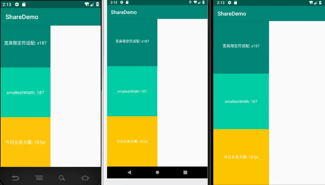 由于density不是固定不变的,所以每个分辨率不同的设备他们的density都肯定不相等,这样就会造成每个设备的宽/高对应的总dp都是不同的,假设480 * 800分辨率的density是1.5,1080 * 1920分辨率的density是2.6,1440 * 2560分辨率的density是3.5。那么它们对应的宽度总dp = (宽度px) / density,分别为320dp、415dp、411dp。可以看出单位为dp的时候三个设备之间的差距就不是很大了,但是这样肯定还是不能满足我们对屏幕适配的要求的。下面来看看Android常见的三种比较成熟的屏幕适配方案,并分析这几种方案的优劣。