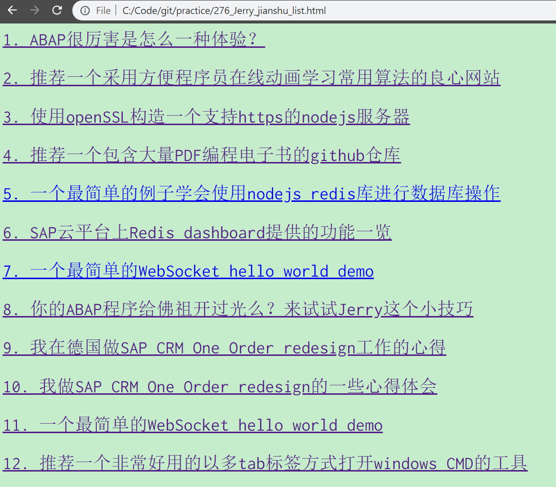 这个nodejs应用执行后,会在本地生成一个html文件,包含每篇文章的标题和超链接。