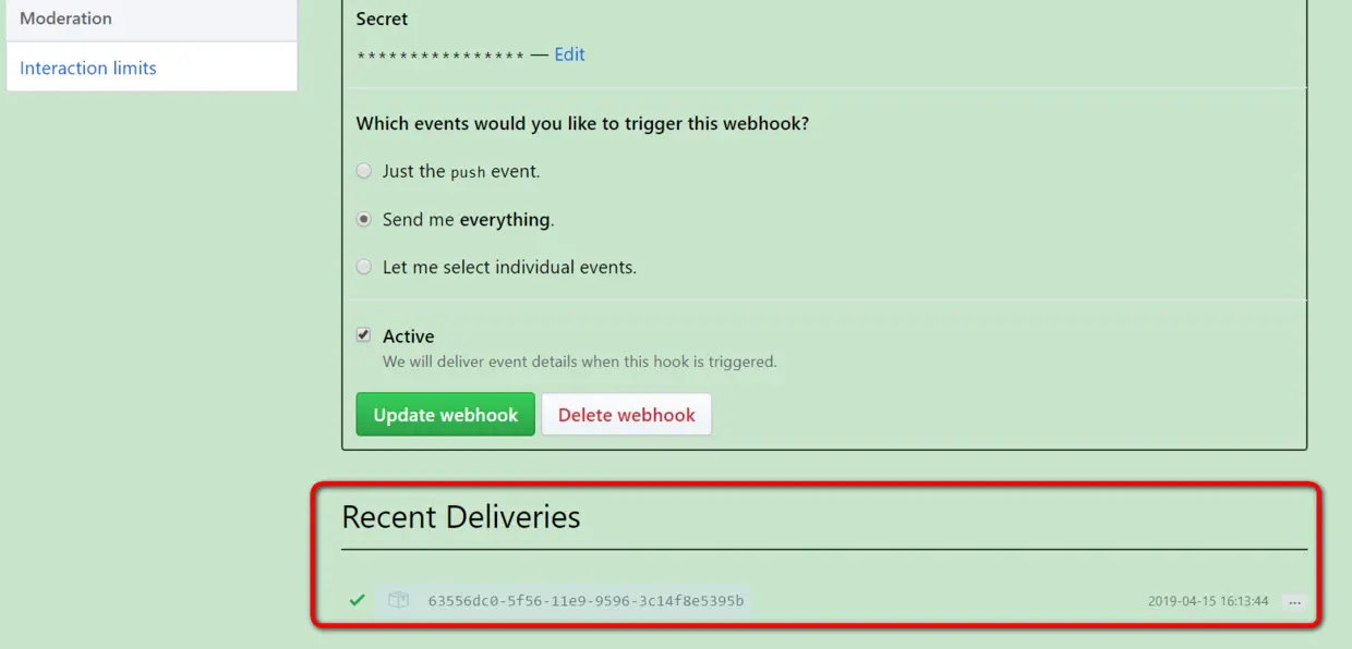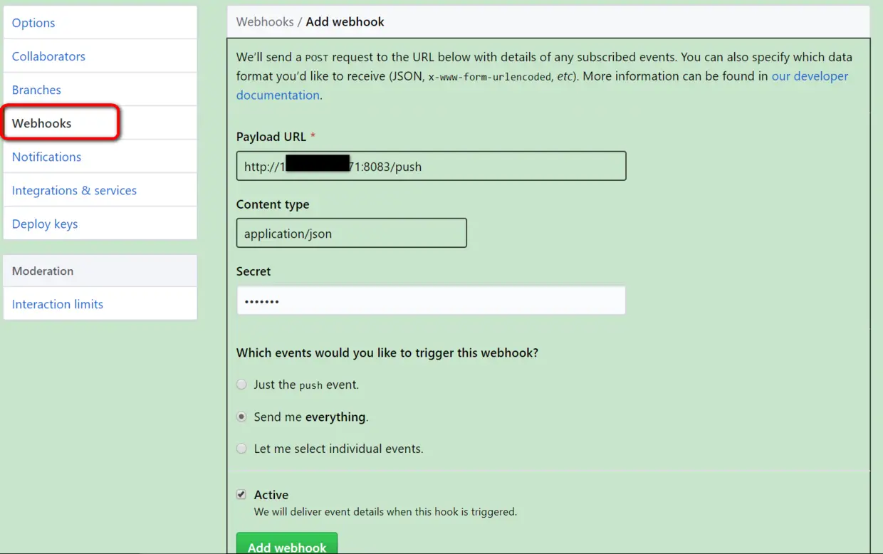 创建后点Add webhook保存,github会发送一个json paload到这个url指定的应用上。