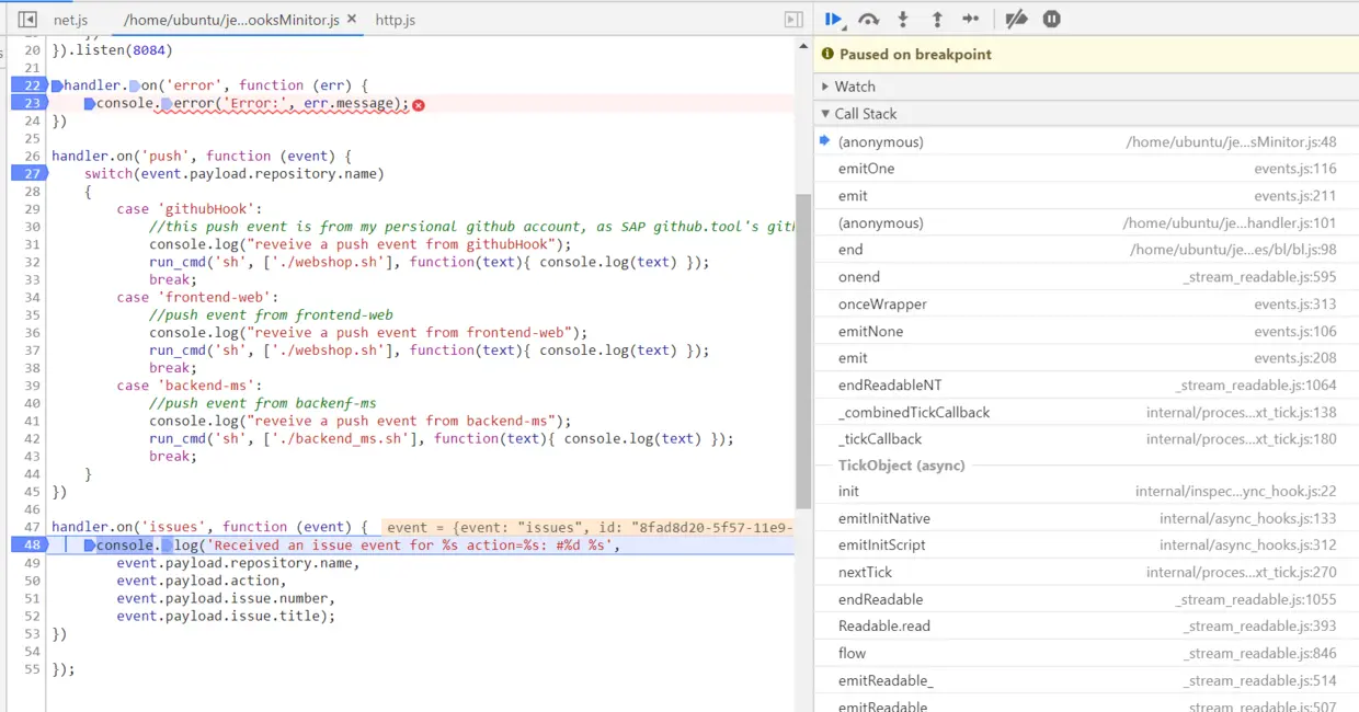 我们现在来做个实验,把webhook指定的url对应的应用设置一个断点,然后在github仓库里新建一个issue: