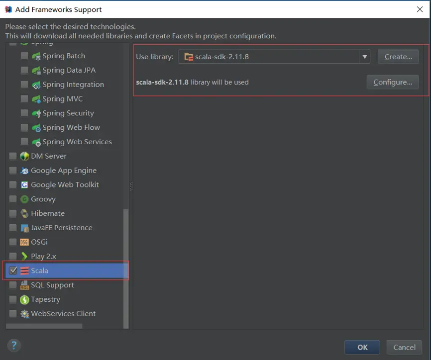 - 在这里选择Scala后,在右边的Use library中配置安装目录即可,最后点击OK。