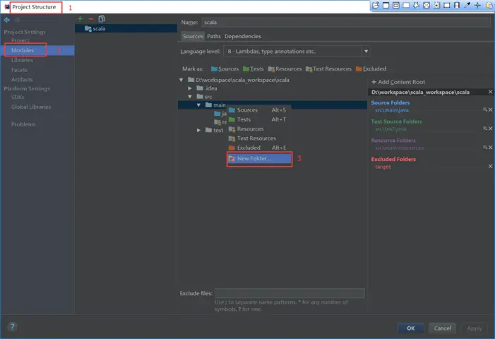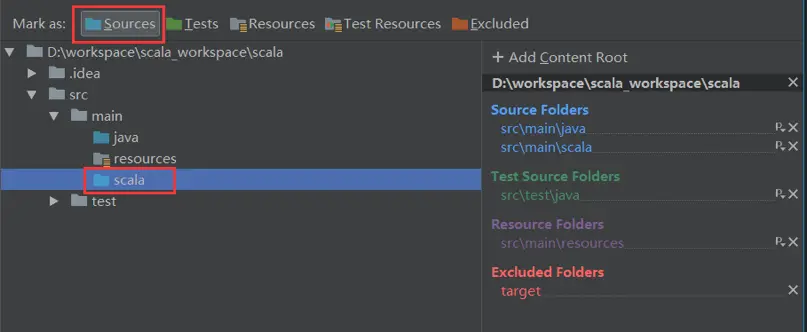- 在项目的目录结构中,创建scala文件夹,并标记为source。