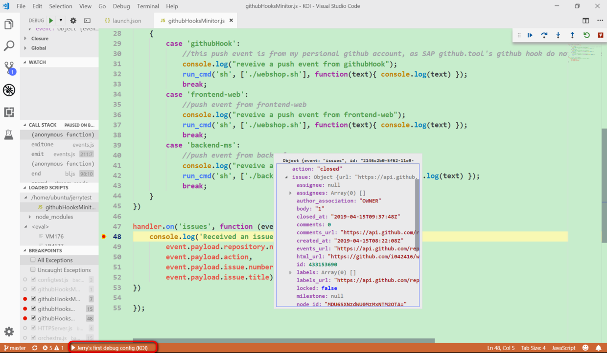 这个issue close事件会自动发送到我的AWS应用,下图可以看到断点触发了,这样我就实现了使用本地的Visual Studio Code远程调试AWS应用的目的。