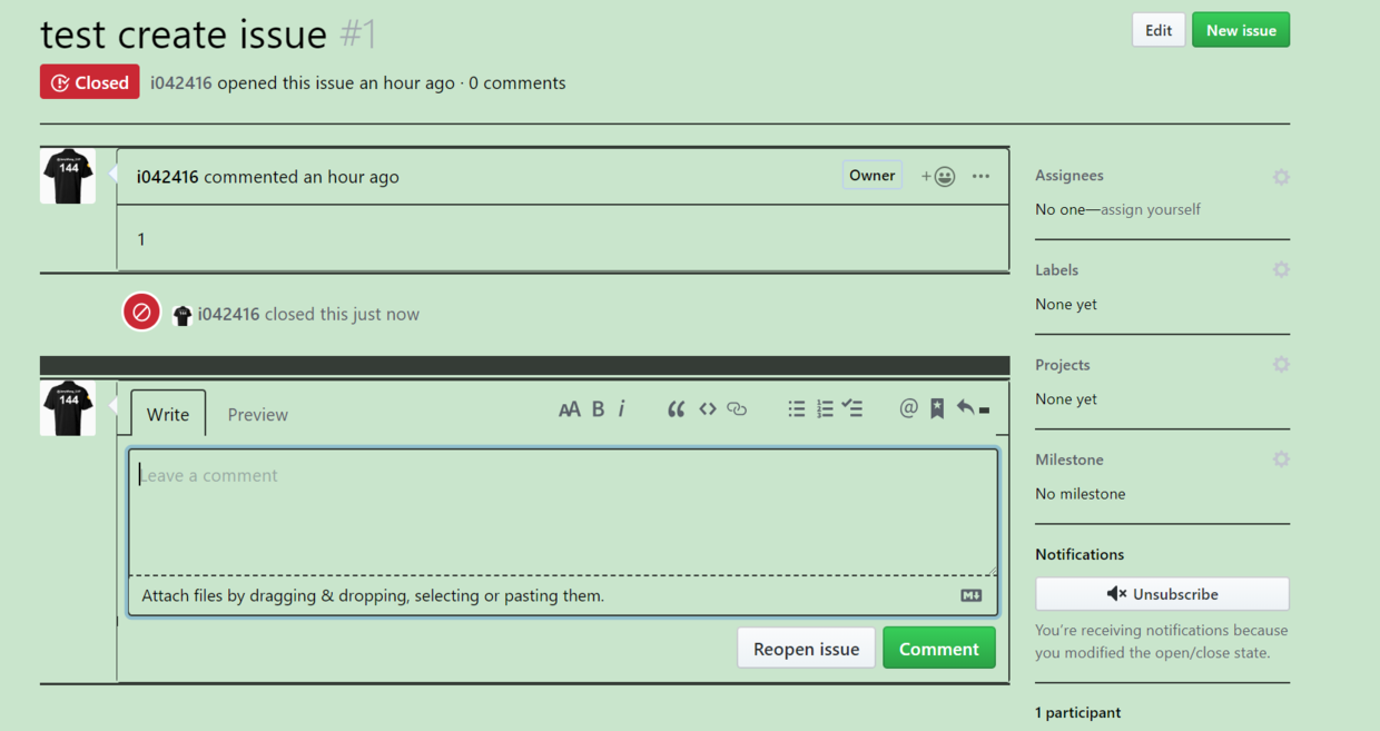现在我创建了一个名为test create issue的issue,一旦我点了Close按钮,