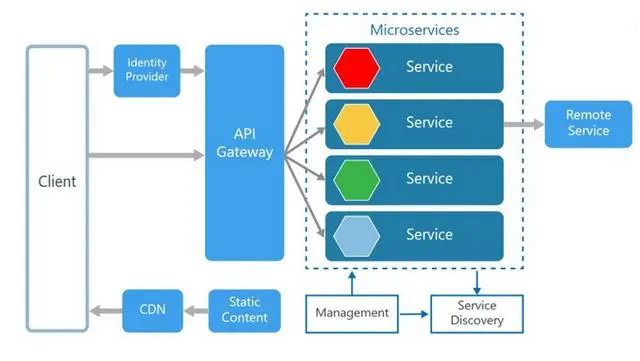 API网关风格的微服务体系结构(图片来自:Microsoft Azure Docs),是用于微服务的最常见的设计模式。API网关是一个中间层,具有最小化的路由功能,只是充当一个“哑管道”,里面没有业务逻辑。一般来说,API网关允许客户端基于REST/HTTP调用托管的API。其他类型的微服务集成模式有:点对点风格(直接从客户端应用程序调用服务)和消息代理风格(实现异步消息传递)。