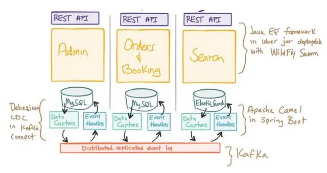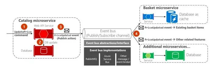尽管上面的图片显示了服务之间的直接连接,但是处理服务间通信的好方法是使用一个简单的事件总线作为中介,以保持最低级别的耦合。