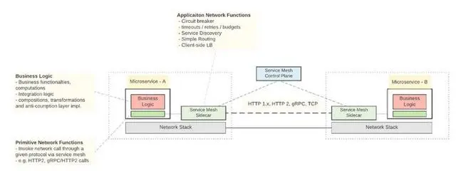 服务网格通过提供服务间通信的辅助架构来实现外挂模式,包括弹性(容错、负载平衡)、服务发现、路由、可观察性、安全性、访问控制、通信协议支持等功能。
