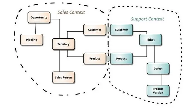 为了处理大型模型和团队,可以应用领域驱动设计(DDD)。DDD通过将大型模型划分为不同的有界上下文来明确他们之间的相互关系和子领域。这些有界上下文可以在应用设计级别转换为单独的微服务。(参见:领域驱动设计中的有界上下文 t.cn/EAAK4Xk)