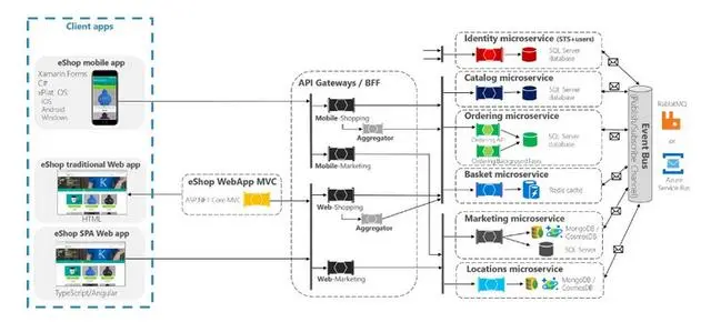 此体系结构是由使用Microsoft技术的Microsoft开发人员提出的。在这里,API Gateway是针对不同的Web和移动用户而定制的。对于数据层,数据存储技术是根据业务功能仔细选择的(关系数据库用于结构化数据,Redis用于临时数据缓存,MongoDB和Cosmos DB用于非结构化数据)。事件总线处理服务间通信。撇开技术不说,这是基于微服务的应用最常见的集成模式。