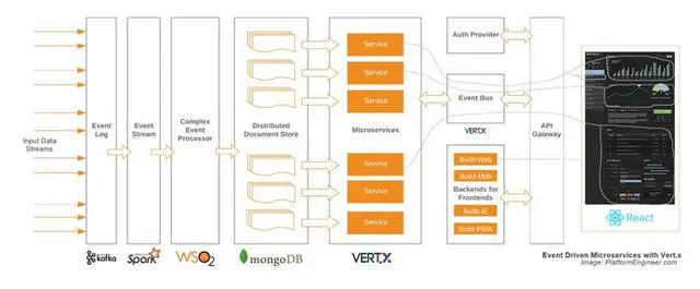 一种非阻塞应用程序的微服务体系结构,该应用程序使用来自各种事件源(例如交通数据、天气指数、股票市场线索、社交媒体帖子、传感器输出)的大量输入数据流来向最终用户显示实时更新。这些输入数据流最初由使用Kafka实现的事件日志收集。它将数据保存在磁盘上,因此可以用于批处理调用(分析、报告、数据科学、备份、审计)或用于实时调用(运营分析、CEP、管理仪表板、警报应用程序)。上图中,使用Spark按指定的时间间隔,将持续的输入数据流划分为微批次,并输入到WSO2 Siddhi CEP引擎中。后者标识事件并使用MongoDB存储以非结构化形式存储数据。微服务调取这些数据并显示给最终用户。仔细观察这一设计, Vert.x事件总线能够创建与前端UI组件的连接,该特性仅用于有效地更新UI中的相关部分。撇开技术不说,这是基于事件驱动的非阻塞微服务应用程序的一个很好的架构。