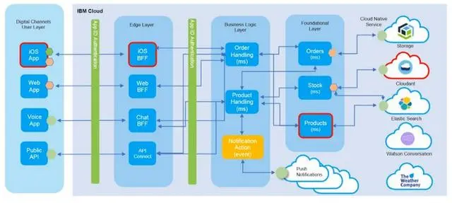 用于订单管理应用程序的云原生泛渠道微服务体系结构(图片:ibm.com)这个设计的一个主要特点是,IBM架构师没有使用API网关,而是为每个客户端通道(移动应用程序、Web应用程序、IOT设备、API使用者)提出了一个具有独立后端的边缘层。另一个特点是将微服务层划分为业务逻辑层和基础层两个子层。基础层(即核心服务层)使用各种云原生服务(云数据存储、集成和索引Watson会话的Elastic搜索引擎)处理持久化和集成任务。业务逻辑层集成了基础层的数据,并提供了有意义的业务功能。这将是一个很好的架构,可以为地理上分散的大量用户群提供服务,并通过各种平台访问应用程序。