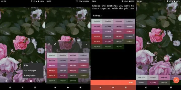 Focus Go 则完全免费且只提供了基本的看图功能,我们不能选择以文件夹形式查看图片,不能过滤文件夹或者为照片加密,甚至不能选择亮色主题,但这并不意味着 Focus Go 毫无亮点。Focus Go 支持安装作者的另一款应用 Graphice 作为插件,这一「插件」能帮助我们提取图片中各种颜色的色值,除了支持长按复制色值外,还支持将选中的多个色值连同图片一并分享出去。