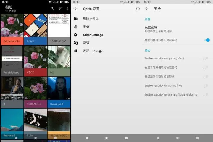 除去「滑动锁」这一功能直击痛点外,Optic 也支持过滤文件夹、为照片设置指纹锁以及更换主题。但是,这款应用默认图片只能以相册形式显示,如果习惯了直接以照片形式显示,这个应用使用下来无疑是极为痛苦的。不知道开发者是基于何种考虑,希望在后续更新中他能够为用户提供更多的查看形式。