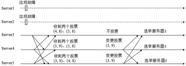 (4) 统计投票。每次投票后,服务器都会统计投票信息,判断是否已经有过半机器接受到相同的投票信息,对于Server1、Server2而言,都统计出集群中已经有两台机器接受了(2, 0)的投票信息,此时便认为已经选出了Leader。