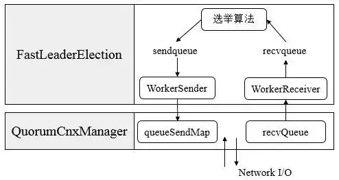 · WorkerSender:选票发送器,不断地从sendqueue中获取待发送的选票,并将其传递到底层QuorumCnxManager中。