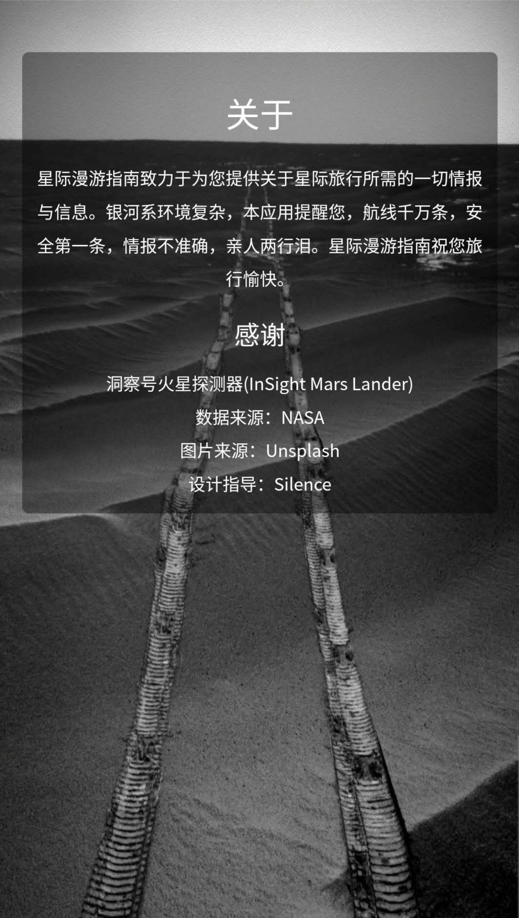 随着地球宇宙空间探索技术的发展以及地球资源的日渐枯竭,必将有部分地球人继承大航海时代探险家们的遗志,向广阔的外太空进发。虽然目前星际航行技术还尚不完善,但是已经有一部分先行者踏出了第一步,为了向星系漫游者们提供充分且完善的情报支持,本人特开发了星系漫游指南这一小程序,该小程序可在任何安装了微信(WeChat)的手持智能设备上使用,而无需考虑平台兼容性,界面简洁大方,功能简单易用,真正做到了即开即用,即用即走,实乃居家旅行,杀人灭口必备应用。