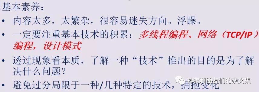 我个人认为从事应用层开发同学的比例最大,也是最能体会“跟不上知识更新步伐”感受的人。这一领域中有没有什么 基础关键技术?我多年观察下来觉得在应用层开发领域,多线程编程 、网络编程、 设计模式等几个是基础关键知识,无论如何要想办法抓在手里。