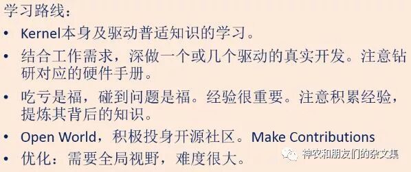 底层开发的工作内容主要是移植和Bug Fix。在某些公司的日常工作中,只要找到解决bug的patch,打上去就好了。为什么会这样?因为Kernel是一个比较稳定的软件。在这里,稳定压倒一切。当然,其中也有非常具有挑战性的工作,比如优化相关的工作等。