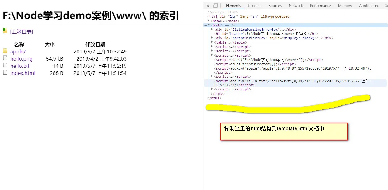 我们可以看到,这里目录列表的主要结构就是一个table标签,我们只需要按照art-template的模板语法来把其中的文件名变成动态的变量,后续就可以按照模板引擎来动态渲染不同的文件了。