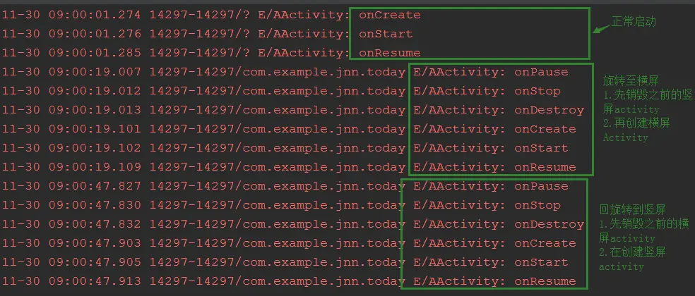 configChanges属性设置 不一致,则Activity会被销毁并使用新的配置重建。 - 以上三句话举个列子,比如 现在横竖屏切换,