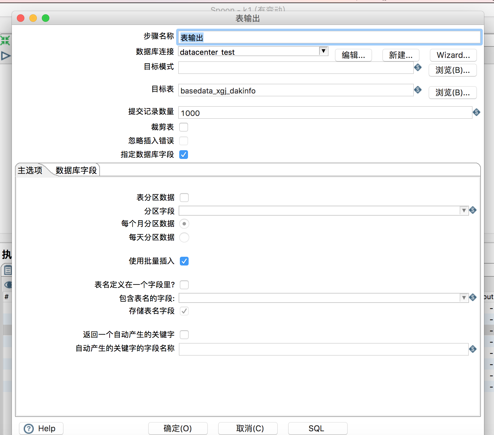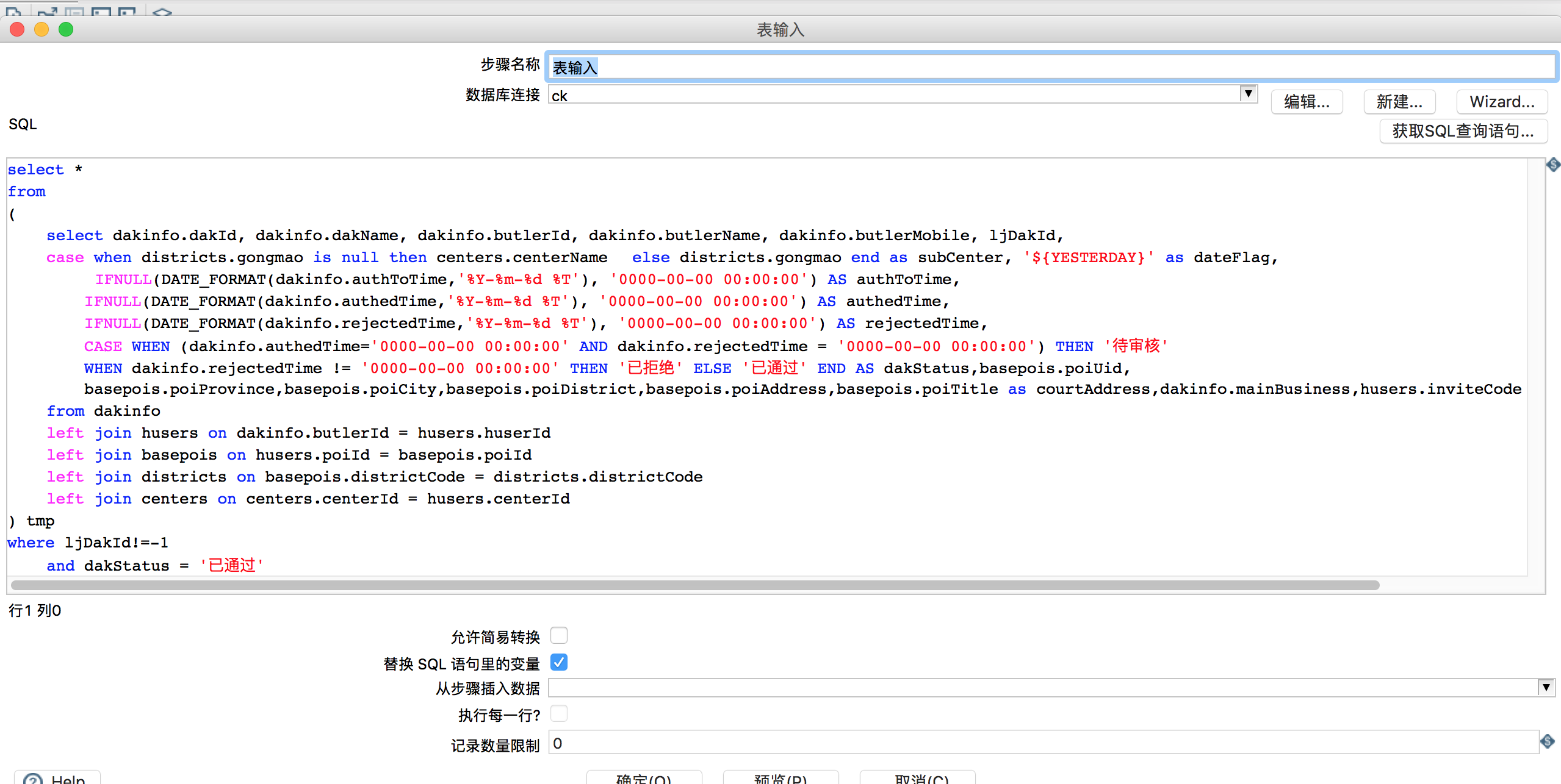 kettle变量使用 码农养家 2019-05-07 1,738 阅读1分钟 公司项目使用kettle重构之前的取数,先研究下日常的使用。 一、建立数据转换,表数据到表输出,其中表输入数据来自其他业务数据库,通过输入sql执行得到数据。 表输入: 表输出: 设置并行4个线程。 二、建立变量的转换 获取系统信息,获取时间参数。 2字段选择,选择字段并修改得到数据的格式 3设置变量。使用上步骤获取的字段设置变量 三、建立job 并选择两段转换执行得到需要的数据。 注意:kettle使用并行执行,所以变量必须在前面的转换已经做完的基础上在使用。