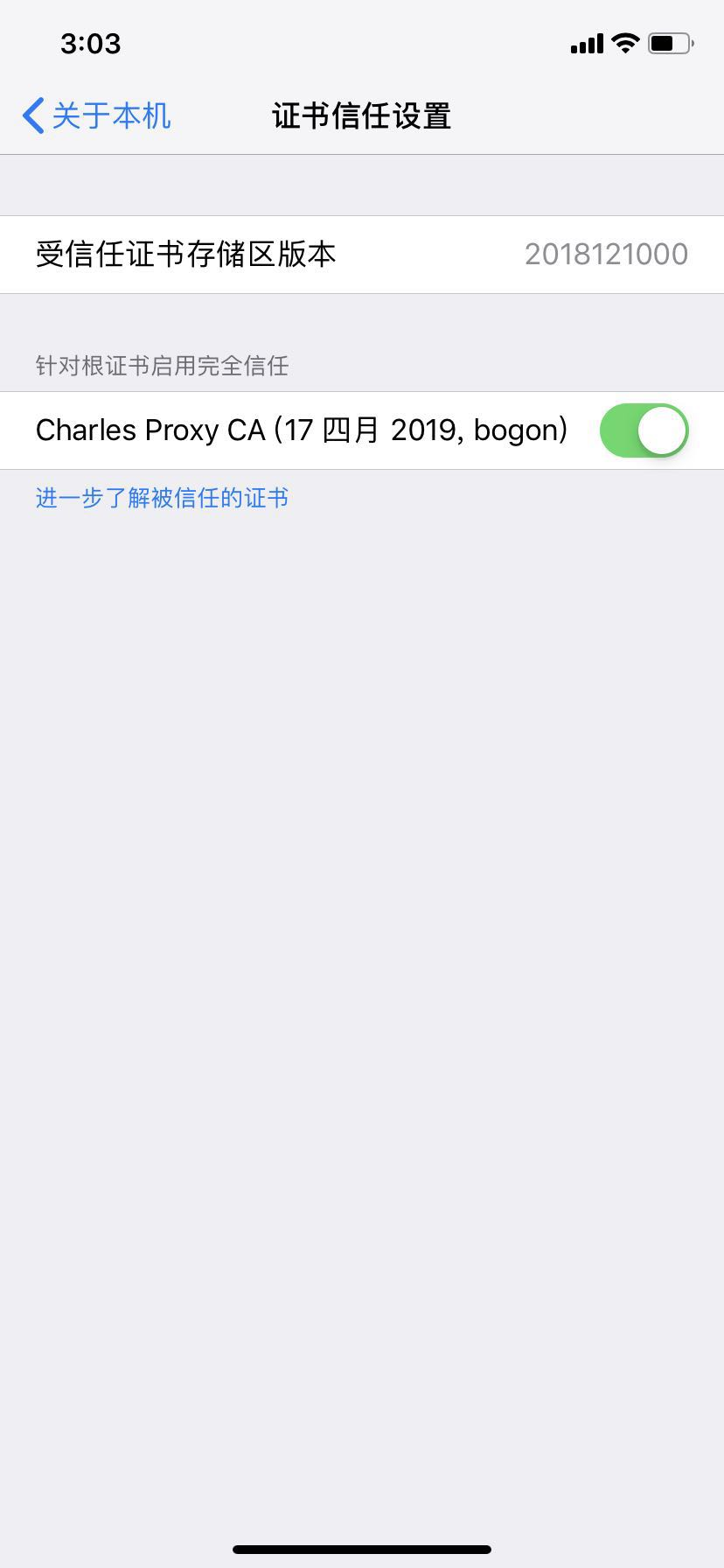 iOS12 Charles https 出错问题 逻辑克 2019-05-07 980 阅读1分钟 之前charles抓手机https包一直没问题,iOS12之后用charles抓https包,老遇到证书信任问题,看证书的页面是这样没问题啊(图1)。但是还需要在通用-关于本机-证书信任设置里点信任(图2)。电脑不行的时候需要Prox- SSL Proxying Settings - add 直接OK OK(图3)。之前端口443就可以,现在好像有问题