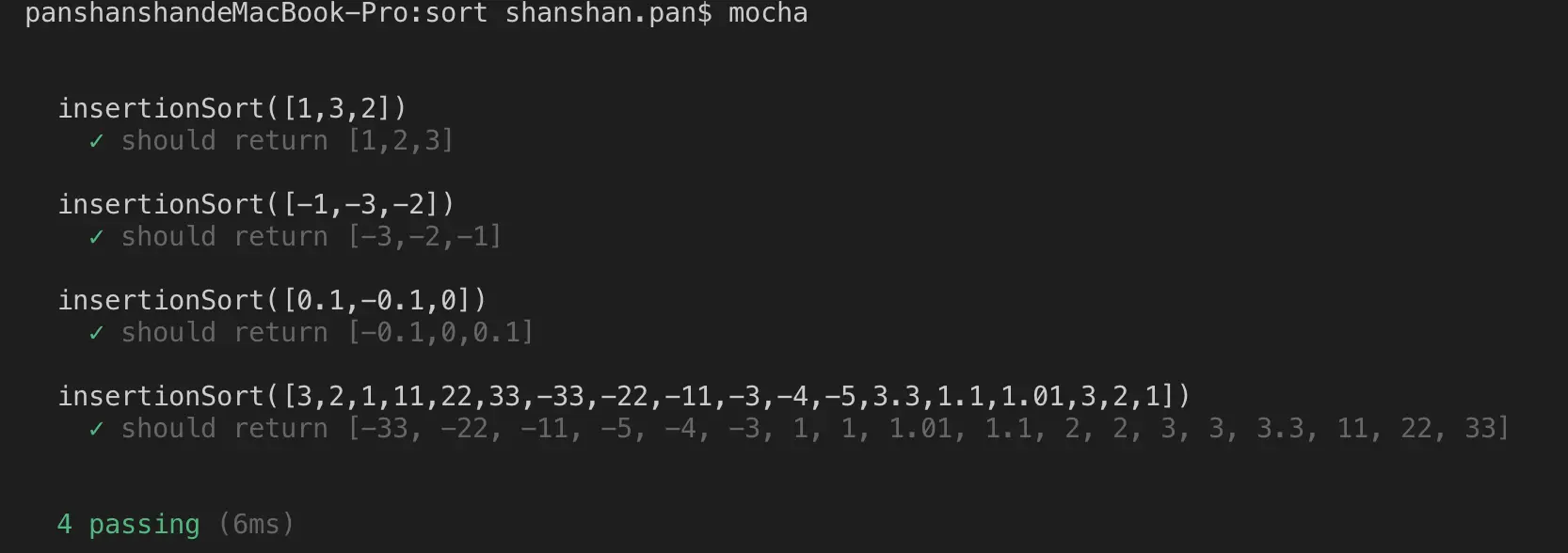 assert.deepEqual( insertionSort([3,2,1,11,22,33,-33,-22,-11,-3,-4,-5,3.3,1.1,1.01,3,2,1]), [-33, -22, -11, -5, -4, -3, 1, 1, 1.01, 1.1, 2, 2, 3, 3, 3.3, 11, 22, 33] )