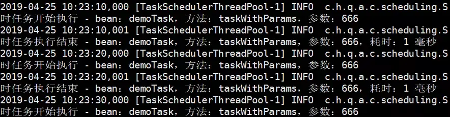 logger.info("定时任务开始执行 - bean:{},方法:{},参数:{}", beanName, methodName, params);