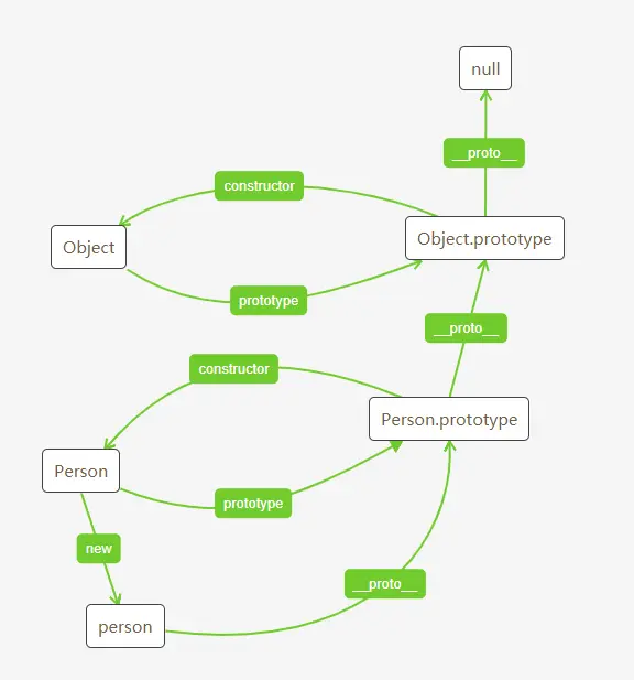 Person.prototype用于共享,Person.prototype.__proto__继承自Object.prototype原型链关系: