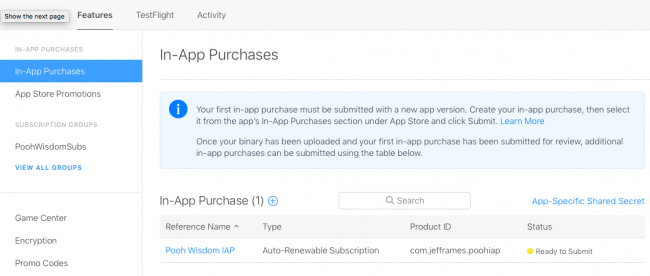 完成后,您的新应用程序内购买的状态将显示为准备提交Ready to Submit。