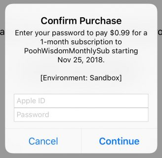 输入您在App Store Connect上创建的沙箱帐户的用户名和密码,点击Continue,然后点击以下弹出窗口中的OK。 如果一切顺利,你现在应该看到你的第一个Winnie the Pooh quote! 我希望这是一个很好的!