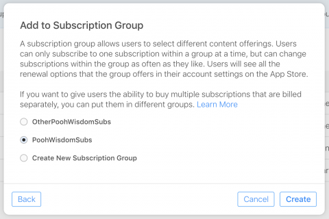 转到App Store Connect并添加另一个可自动更新的订阅产品。 当系统提示您选择新产品的订阅组时,请选择您之前创建的相同PoohWisdomSubs组。
