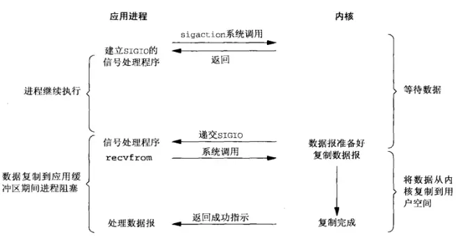 我们首先开启套接字的信号驱动I/O功能,通过sigaction系统调用安装一个信号处理函数,系统调用立即返回,进程继续工作,当数据包准备好时内核产生一个SIGIO信号通知,我们通过recvfrom调用读取数据报。信号驱动式I/O模型的优点是我们在数据报到达期间进程不会被阻塞,我们只要等待信号处理函数的通知即可