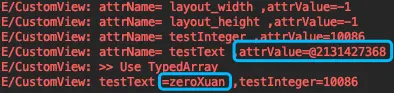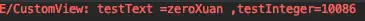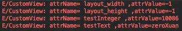 public CustomView(Context context, AttributeSet attrs) { super(context, attrs); final int count = attrs.getAttributeCount(); for (int i = 0; i < count; i++) { String attrName = attrs.getAttributeName(i); String attrValue = attrs.getAttributeValue(i); Log.e(TAG, "attrName= " + attrName + " ,attrValue=" + attrValue); } Log.e(TAG, ">> Use TypedArray"); TypedArray a = context.obtainStyledAttributes(attrs, R.styleable.CustomViewTest); String testText = a.getString(R.styleable.CustomViewTest_testText); int testInteger = a.getInteger(R.styleable.CustomViewTest_testInteger, 10); Log.e(TAG, "testText =" + testText + " ,testInteger=" + testInteger); a.recycle(); } - 运行结果