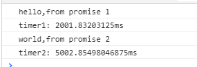 验证成功,在2秒后触发了第一个then回调,并接收到了hello,from promise1的返回值,在5秒后触发了第二个then回调,并接收到了"world,from promise2"的返回值