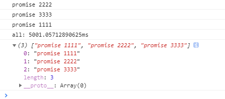 写好之后运行,可以得到并行的结果,但是还存在一点问题,Promise.all resolve后返回的结果数组顺序不能保证和传入的promise一致, 感谢tk103331的提出,因此还需要改写一下,上面的代码是用push,因此顺序是按照时间顺序往后追加结果的,如果传入的数组下标直接给结果数组赋值,就可以解决此问题。