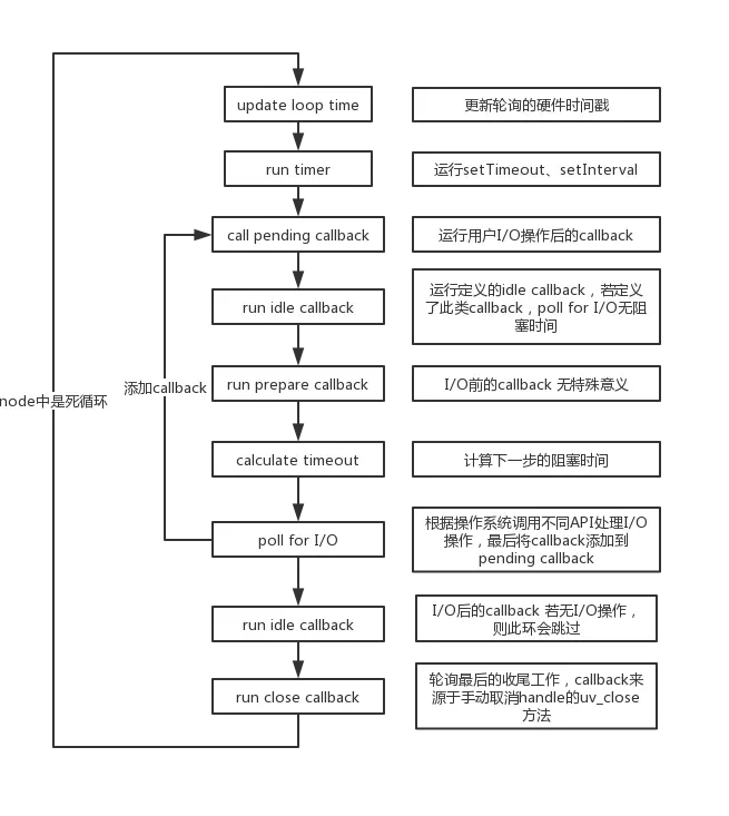1、根据计算的timeout来进行I/O操作,这里的操作包括fs.readFile、fs.stat等,期间进程将被阻塞。