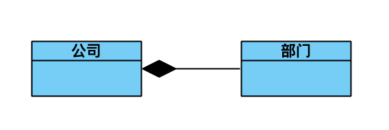 组合关系用一条带实心菱形箭头直线表示,与聚合关系一样,组合关系同样表示整体由部分构成的关系,不同之处在于整体和部分是强依赖关系,如果整体不存在了,部分也不复存在。如图为例,如果公司倒闭了,那么何来部门呢?