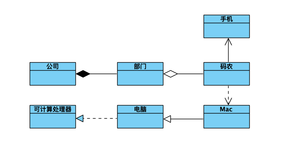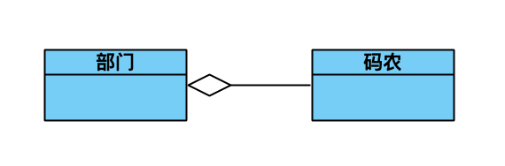 聚合关系用一条带空心菱形箭头的直线表示,如图码农和部门就是聚合关系。与组合关系不同的是,整体和部分不是强依赖的,即使整体不存在了,部分仍然存在。如图为例, 部门撤销了,码农换一个工作还是码农嘛。