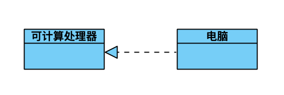 实现关系用一条带实心箭头的虚线表示。如图为例,电脑和可计算处理器就是实现关系,通常程序里面实现关系表现为继承抽象类。比如我们平时写的 Readable,Printable等接口的实现。