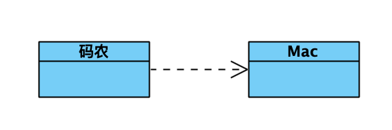 依赖关系是用一套带箭头的虚线表示,他通常描述一个对象在运行期间会用到另一个对象的关系。如图为例码农只有在工作的时候才会用到 Mac 电脑,所以这种依赖关系是依赖于运行状态的。通常情况下是在程序里面通过构造函数、形参等体现。