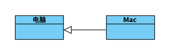 泛化关系用一条带空心箭头的直接表示。如图为例, Mac 和电脑就是泛化关系,通常在程序里面泛化表现为继承于非抽象类。