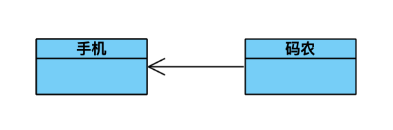 关联关系通常用一条直线表示,当然如果需要标明方向可以添加箭头。它是描书不同的类对象之间的关系,通常不会随着状态的变化而变化,可以理解为被关联者属于关联者的一部分。如图为例,手机就是码农的一部分,不会因为他上班与否而变化所属关系。通常情况在程序里面以类变量的方式表现。