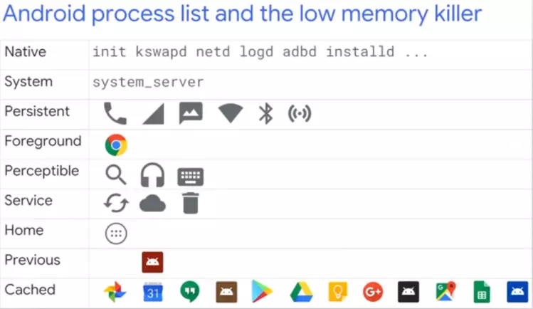 为了避免 Cached Pages 太少时导致设备卡顿、死机、重启等情况,Android 引入了 LowMemoryKiller(源自 Linux OOM Killer) 机制,提前回收优先级比较低的进程所占的资源,以保证一个较好的用户体验。进程优先级列表由 SystemServer 进程维护: