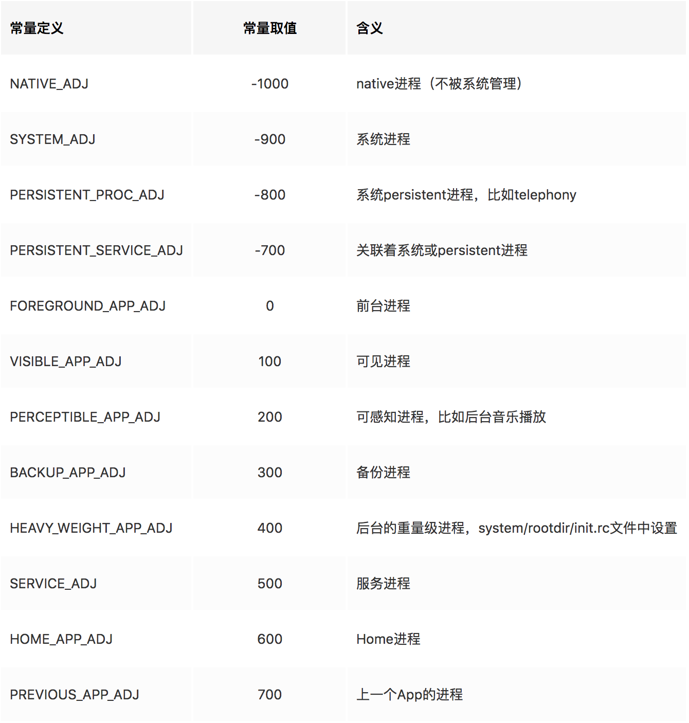 当触发 LowMemoryKiller 机制时,可根据日志中进程的 adj 值,具体分析进程是在什么状态下被杀死的。