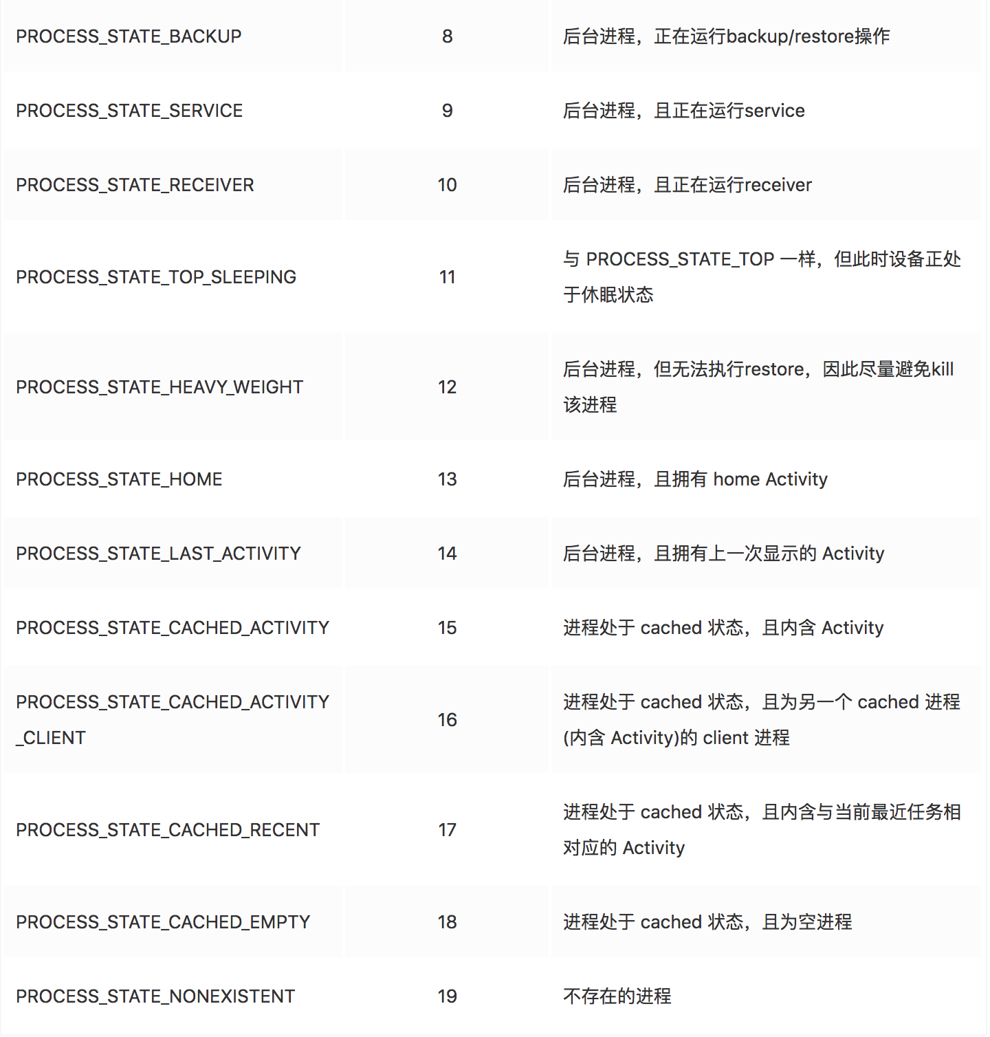 包含目前对用户不可见的 Activity 的进程(已调用 Activity 的 onStop() 方法)。